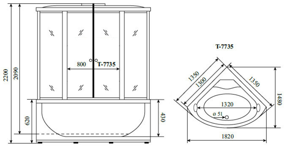 - Комплектация: подголовник, зеркало, полки, душевая лейка