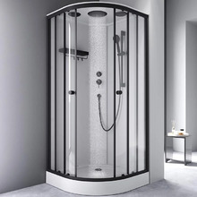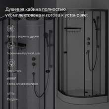 Комплектация: поддон, профили, передние стекла, набор креплений, задние стенки, верхний душ, ручной душ, купол с верхним душем, инструкция