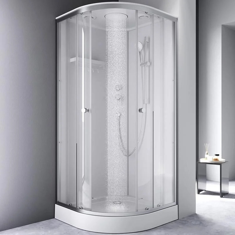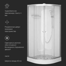 Комплектация: поддон, профили, передние стекла, набор креплений, задние стенки, верхний душ, ручной душ, купол с верхним душем, инструкция