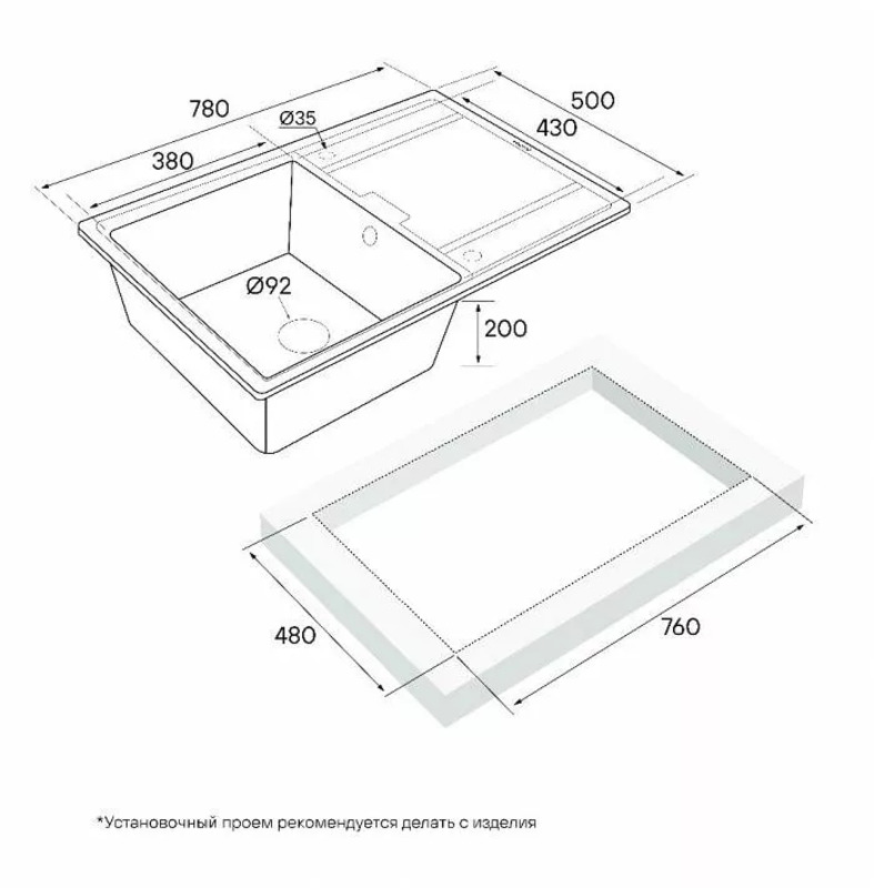 - Монтажная длина х ширина: 480 х 760 мм