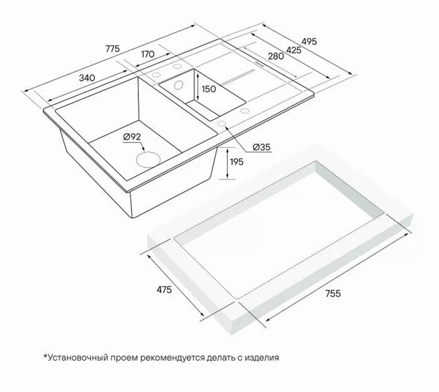 - Размер чаши (ДхШхВ): 425 х 340 х 180 / 280 х 170 х 150 мм
