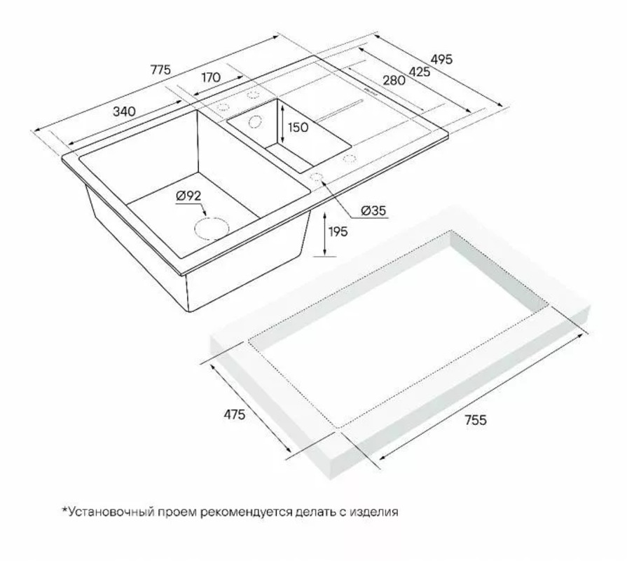 - Монтажная длина х ширина: 475 х 755 мм