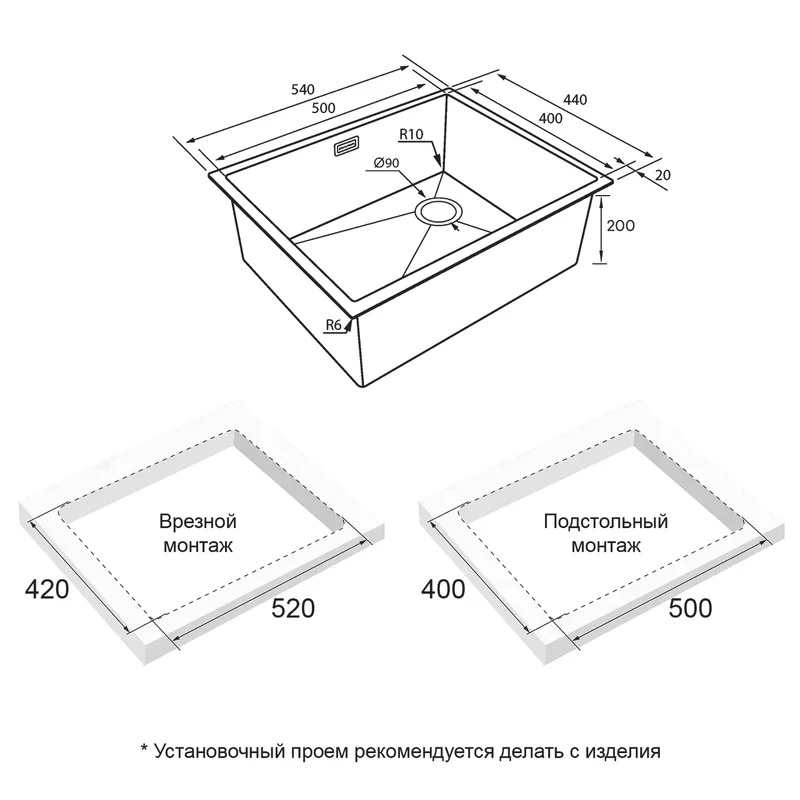 - Мин. ширина шкафа для монтажа мойки: 60 см