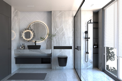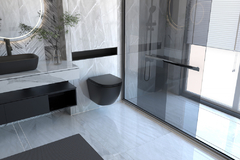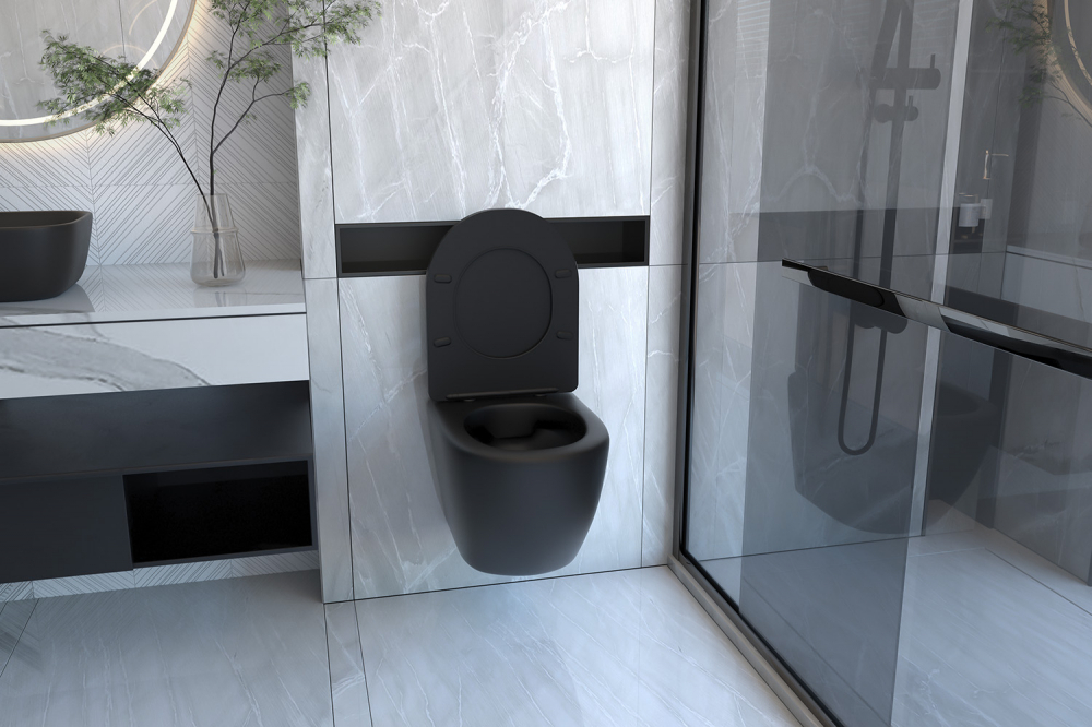 Состоит из подвесного керамического унитаза с каскадным смывом, сиденья для унитаза из дюропласта с микролифтом, инсталляции AC0105, кнопки смыва из нержавеющей стали, в цвете черный матовый.