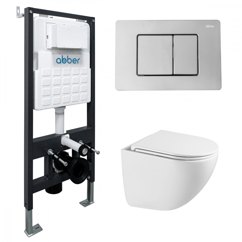 Комплект подвесной унитаз ABBER Bequem AC1131TC белый, с закрытым дном с инсталляцией AC0105 и кнопкой AC0120 хром глянцевый