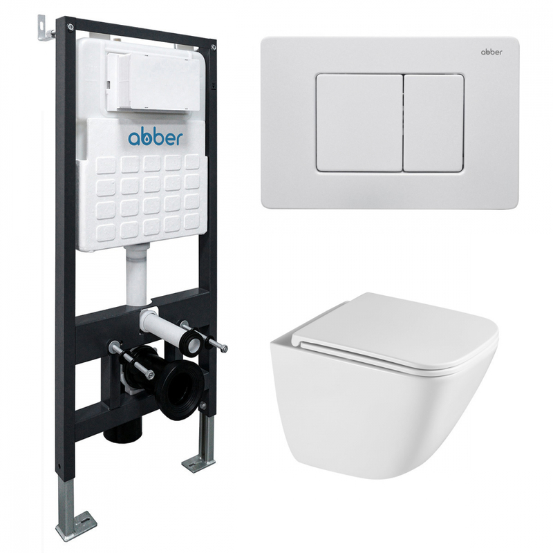 Комплект подвесной унитаз ABBER Rechteck AC1220TC белый, с закрытым дном с инсталляцией AC0105 и кнопкой AC0120MW белая матовая