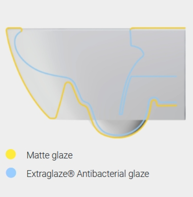 Глазуровка Dual Glaze+, специально разработанная для полной гигиены, сочетает в себе элегантную матовую отделку снаружи с блестящей, легко моющейся Extraglaze ® Antibacterial отделкой с внутренней стороны, где детали соприкасаются с водой. DualGlaze+ предназначена для предотвращения негигиеничных отложений извести, что является частым явлением из-за пористой природы керамических изделий с одним матовым покрытием