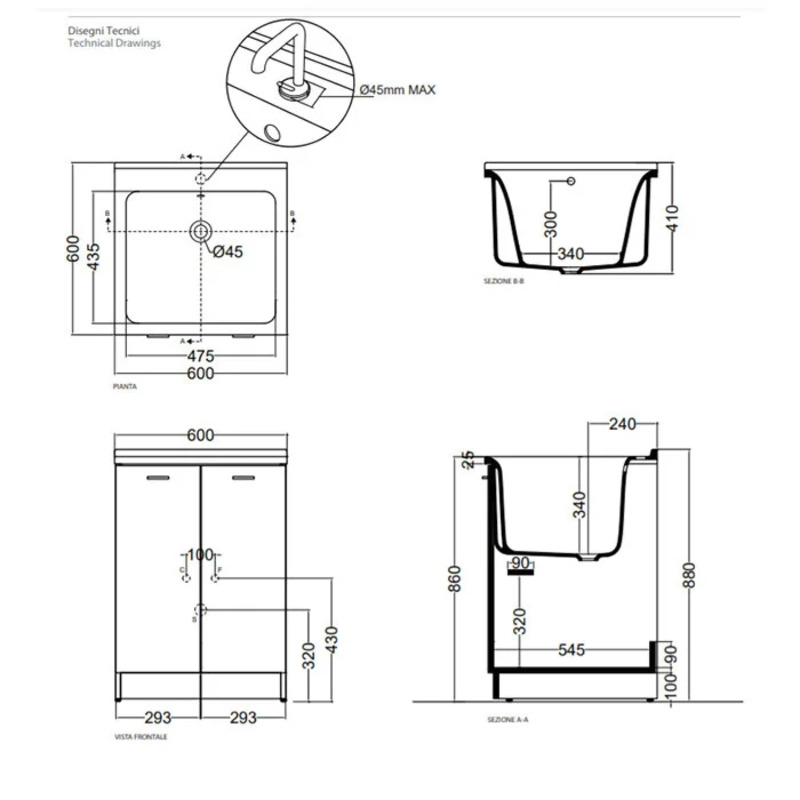 Хозяйственная раковина Kerasan Aquadom 029401*0, 60 см, без отверстия, без тумбы и сифона 7535, белый