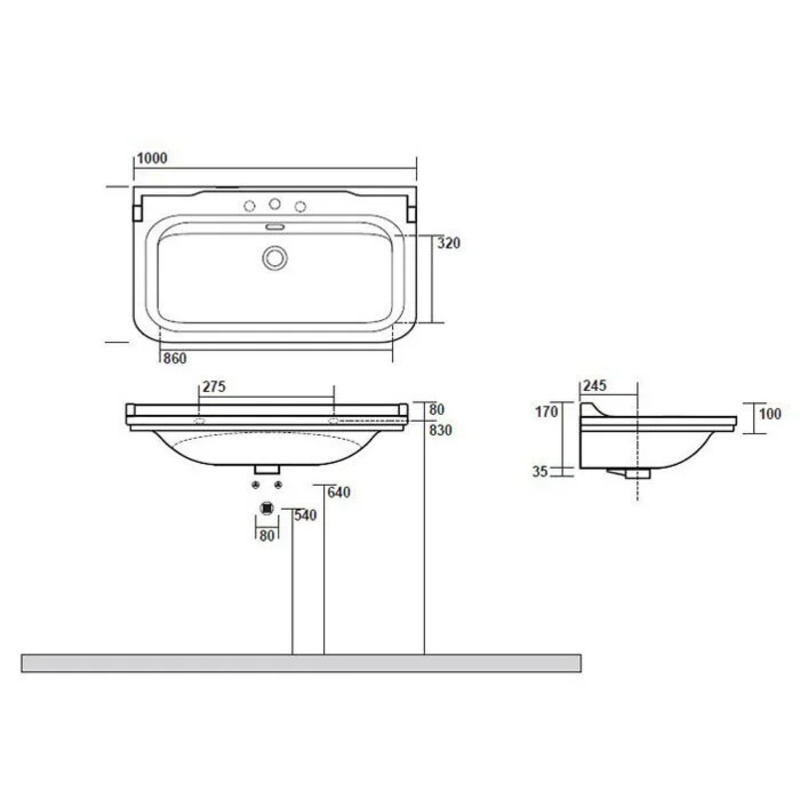Раковина керамическая Kerasan Waldorf 4142K1bi/cr*3 , 100 см, 3 отверстия под смеситель, белая, заглушка хром