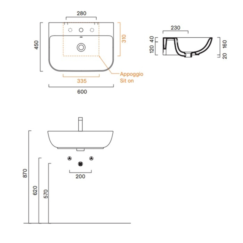 Раковина подвесная/встраиваемая сверху. С отверстием под смеситель. С переливом. Покрытие Cataglaze+