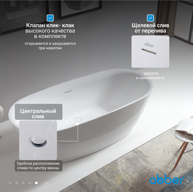 Акриловая ванна ABBER AB9205 - качественный товар по разумной цене. Она подходит для тех, кто стремится создать стильное и функциональное пространство в своей ванной комнате. Преимущества данной модели, такие как высококачественный материал, литая конструкция, удобный слив-перелив и продуманный дизайн, делают её одной из наиболее привлекательных в своем сегменте.