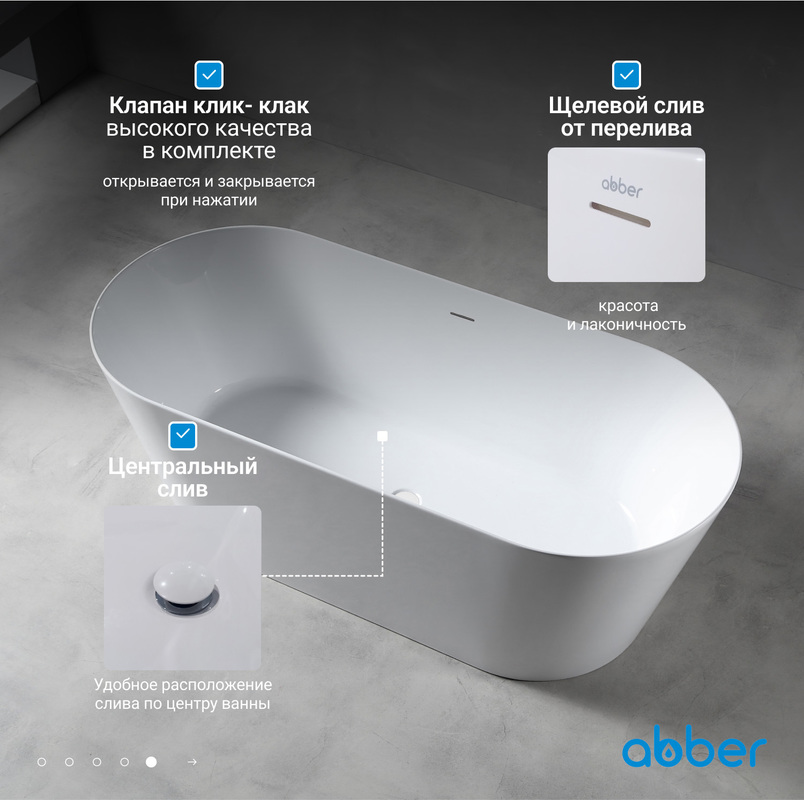 ABBERR AB9222-1.5 — это отдельностоящая ванна, что упрощает процесс монтажа и позволяет легко интегрировать ее в различные дизайнерские решения. Позиционирование слива по центру обеспечивает удобство в использовании.