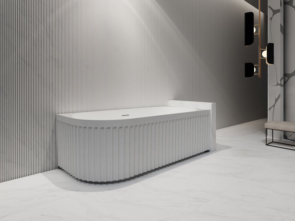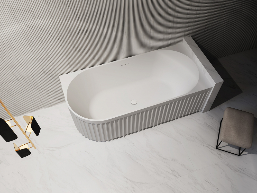 Долговечность и прочность акриловой ванны обеспечиваются за счет цельнолитого конструкции из однородного листа акрила толщиной 4 мм. Ванна комплектуется щелевым сливом-переливом и донным клапаном клик-клак. Объем ванны составляет 210 литров. В комплекте с акриловой ванной предоставляется каркас и ножки. Ванна предназначена для пристенной установки.