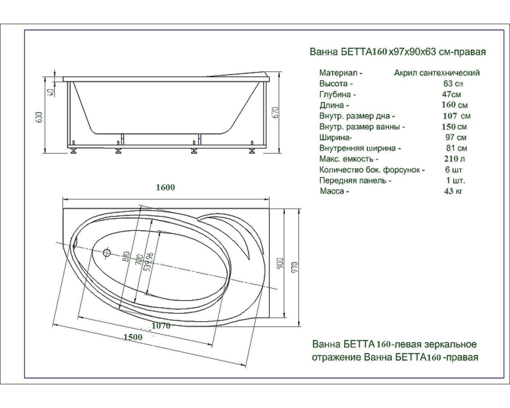 Акриловая ванна Aquatek Бетта 160х97 R BET160-0000170 цвет Белый без панелей, каркаса и слив-перелива