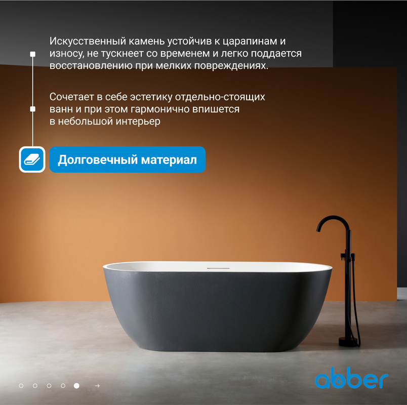 Ванна ABBER Frankfurt AM9941BW предназначена для отдельностоящей установки и изготовлена из композитного камня Rock. Материал сочетает прочность минеральных компонентов и устойчивость современных полимеров, что обеспечивает надежность и долговечность изделия. Черно-белая матовая поверхность придает модели выразительный внешний вид и позволяет гармонично сочетать её с сантехникой и отделкой в современном стиле.