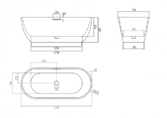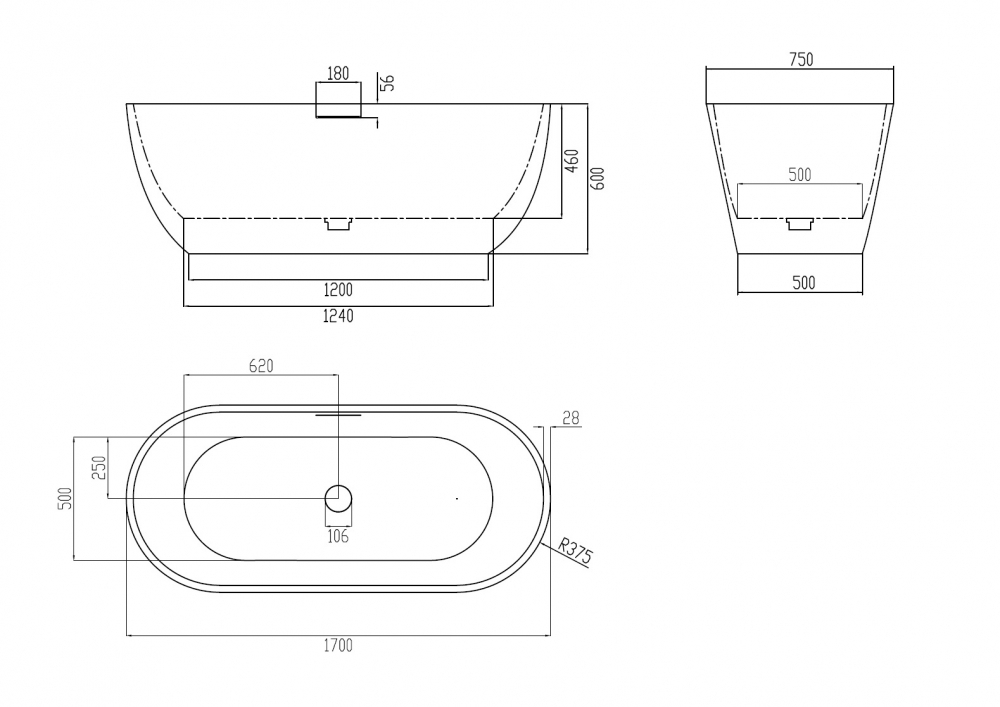 Габариты ванны — 170×75×60 см, глубина чаши 46 см, объем 325 литров. Эти параметры обеспечивают комфортное использование для одного человека. Центрическое расположение слива способствует равномерному распределению воды и удобству при уходе. Конструкция монолитная, без швов, что исключает протечки и повышает долговечность изделия.