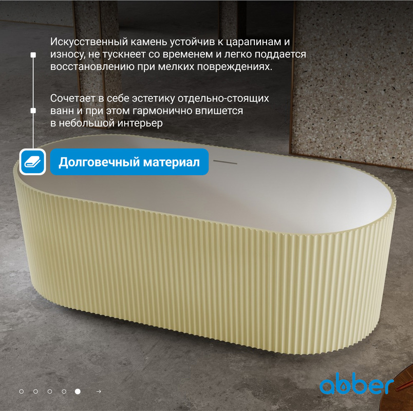 Изделия из искусственного камня ABBER Stein обладают высокой прочностью и устойчивостью к механическим повреждениям, а также не подвержены коррозии и влиянию агрессивных сред. Благодаря этому, они сохраняют свой первоначальный вид на протяжении многих лет и не требуют специального ухода.