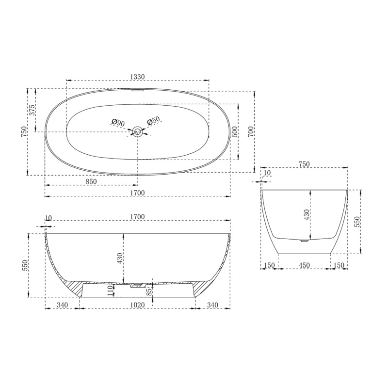 Ванна из искусственного камня ABBER Stein AS9624-1.7 белая матовая