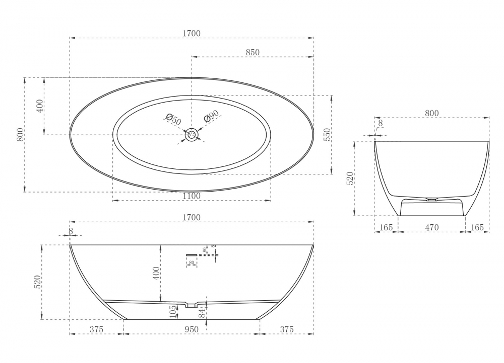 Ванна из искусственного камня ABBER Stein AS9625-1.7 белая матовая