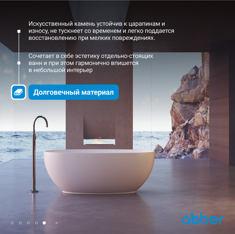 Изделия из искусственного камня ABBER Stein обладают высокой прочностью и устойчивостью к механическим повреждениям, а также не подвержены коррозии и влиянию агрессивных сред. Благодаря этому, они сохраняют свой первоначальный вид на протяжении многих лет и не требуют специального ухода.